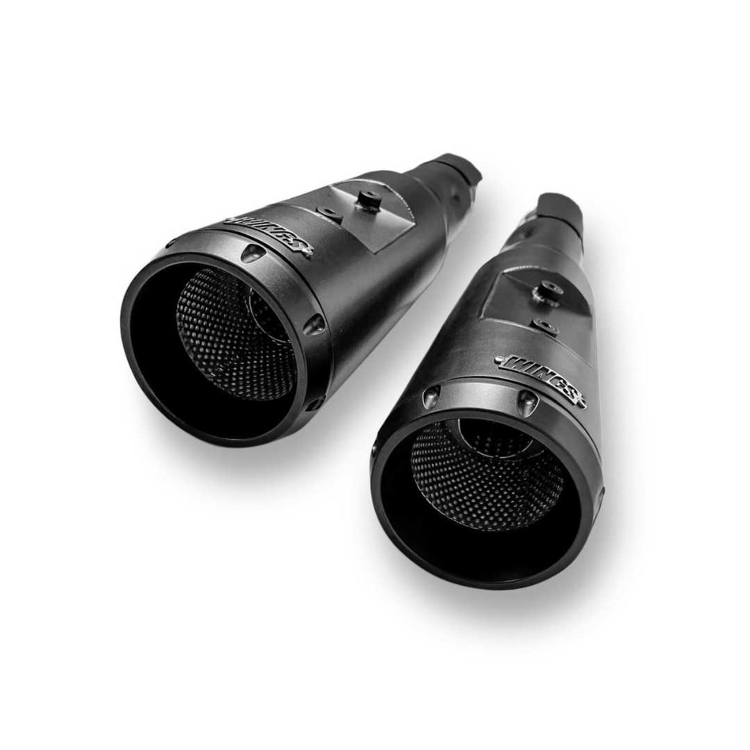 Suas curvas progressivas foram inspiradas na experiência da Wings em sistemas de escapamentos esportivos para provas de Drag-Race, garantindo um fluxo otimizado e resposta sonora precisa. O muffler de dois estágios trabalha para absorver as ondas de choque de retorno, ao mesmo tempo em que potencializa o som grave característico do motor V-TWIN.